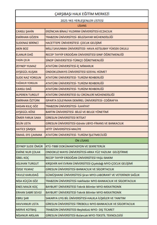 2024-2025 Eğitim öğretim yılında açılan üniversiteye hazırlık ( mezun öğrencilerimize yönelik) DYK kursumuzdan 19 öğrencimiz 4 yıllık, 13 öğrencimiz de 2 yıllık bölümlere yerleşti. Yıl boyunca öğrencilerimizin başarısı için fedakarca çalışan tüm arkadaşlarımıza teşekkür ediyoruz.